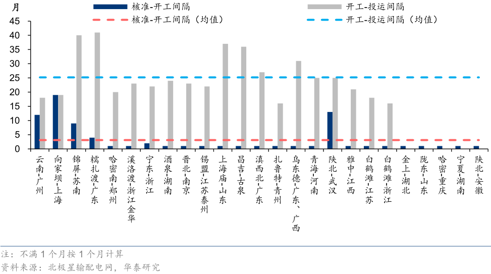 一般配套的特高压工程完工时间会领先水电站投运时间0.5-2年左右,而特高压直流工程核准到开工的时间均值为3个月,开工到投运的均值为25个月。