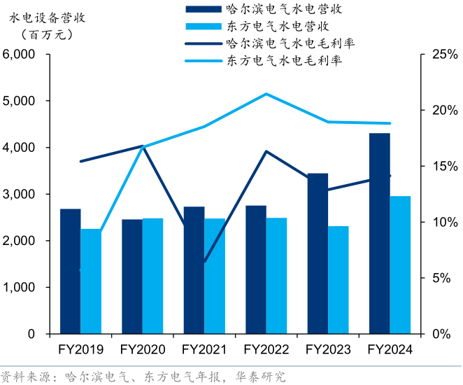 哈电、东电水电设备订单(2019-2024) | 哈电、东电水电营收与毛利率(2019-2024) |
