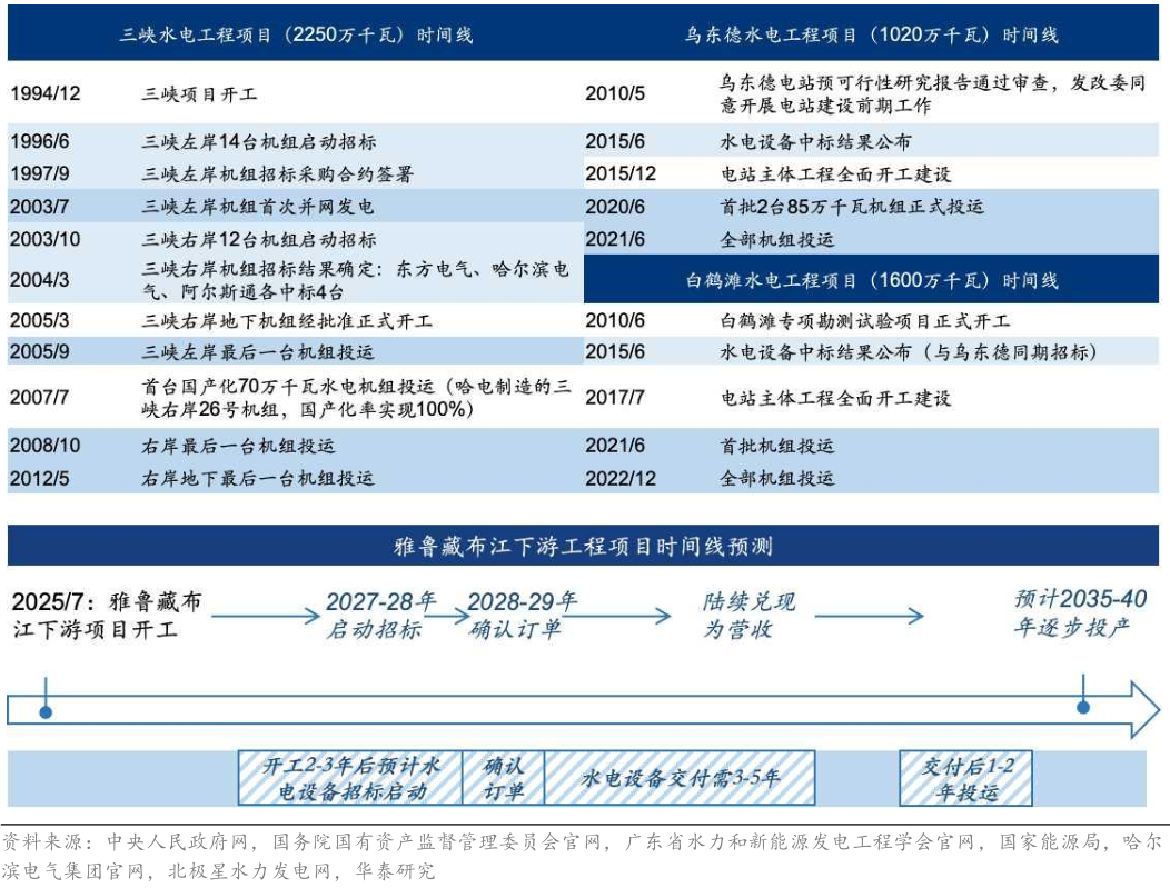 时间线方面:参考三峡、乌东德、白鹤滩等大型水电项目,项目开工后第2-3年启动设备招标,第3-4年确认订单,订单从确认到交付3-5年;我们预计雅江下游项目或在2028-29年带来新增订单高峰,此后陆续兑现为营收。