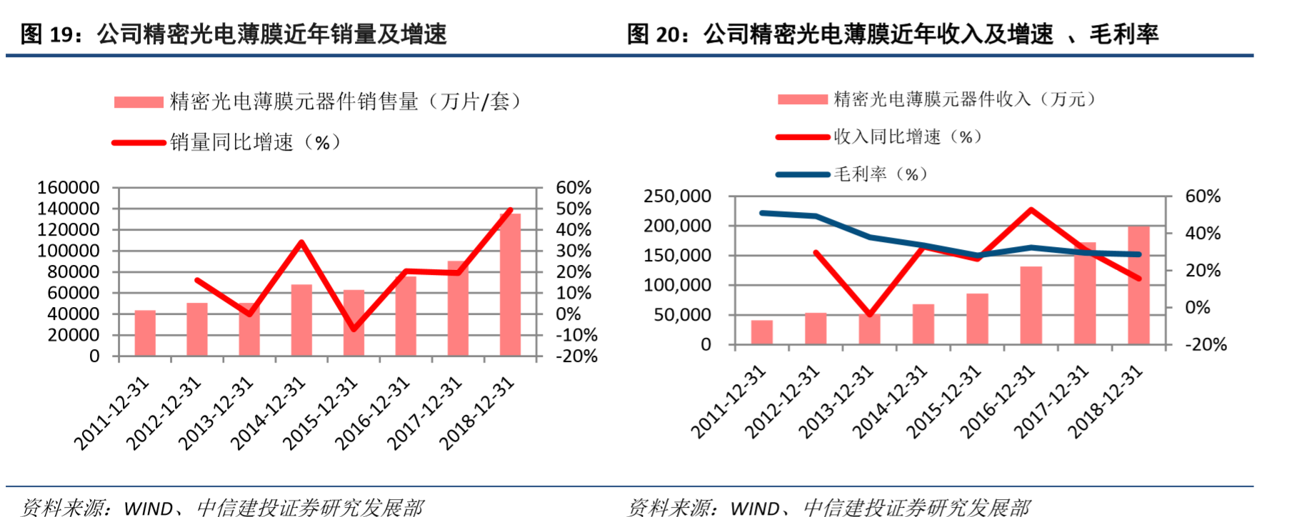 基于深厚的光学薄膜工艺沉淀,公司具备屏下指纹识别滤光片量产能力,产品已在华为Mate20等产品导入使用,预计收入增长受益于光学屏下指纹识别方案的应用推广。