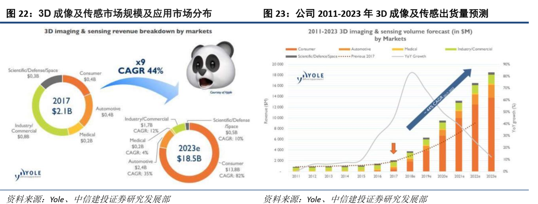 随着AR/VR等新应用的成熟,3D成像自2019年下半年有望迅速渗透,了解到2020年包括苹果新一代机型及主流安卓旗舰机型均有望搭载3D成像方案,Yole预计手机3D成像渗透率将从2018年的13.5%迅速上升至2023年的55%。此外,3D成像和传感技术会逐步扩展至更多的消费类产品(尤其是消费类机器人)、汽车、工业和医疗设备。