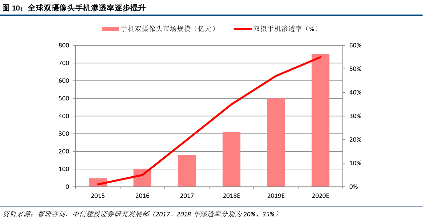 智能手机行业总体从增量增长转为存量竞争,光学领域成为智能手机创新的重要方向,终端用户对于手机拍照质量的要求不断提高。双摄作为手机厂商普遍采用的提高拍照质量与用户拍摄体验的技术手段,已基本渗透高端机型,根据旭日大数据,2016年双摄手机渗透率仅为5%,预计2020年将达到60%。