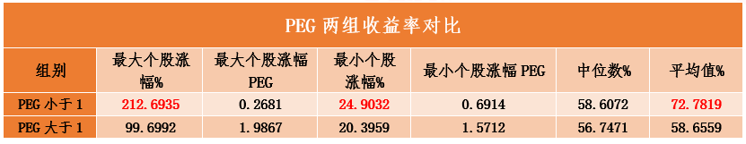 接下来,我们对PEG大于1和小于1的两组标的分别建立等比例的标的池,观察其2019年的走势,我们发现,两组公司在2019年都实现了普涨,但是PEG小于1的组别不论是个股的最大涨幅,最小涨幅,或是平均涨幅,都要显著大于PEG大于1的组别,其中平均涨幅跑赢了14.13个百分点。
