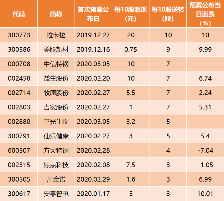 根据公告统计,截至3月5日晚间,43家公司披露了2019年度分配预案,其中分配预案中包含送转的公司有12家。送转方案来看,目前每10股送转比例最高的是拉卡拉,公司拟10送转10股;其次是美联新材,送转比例为每10股送转9股;牧原股份、益生股份、中信特钢等紧随其后,送转比例为每10股送转7股。
