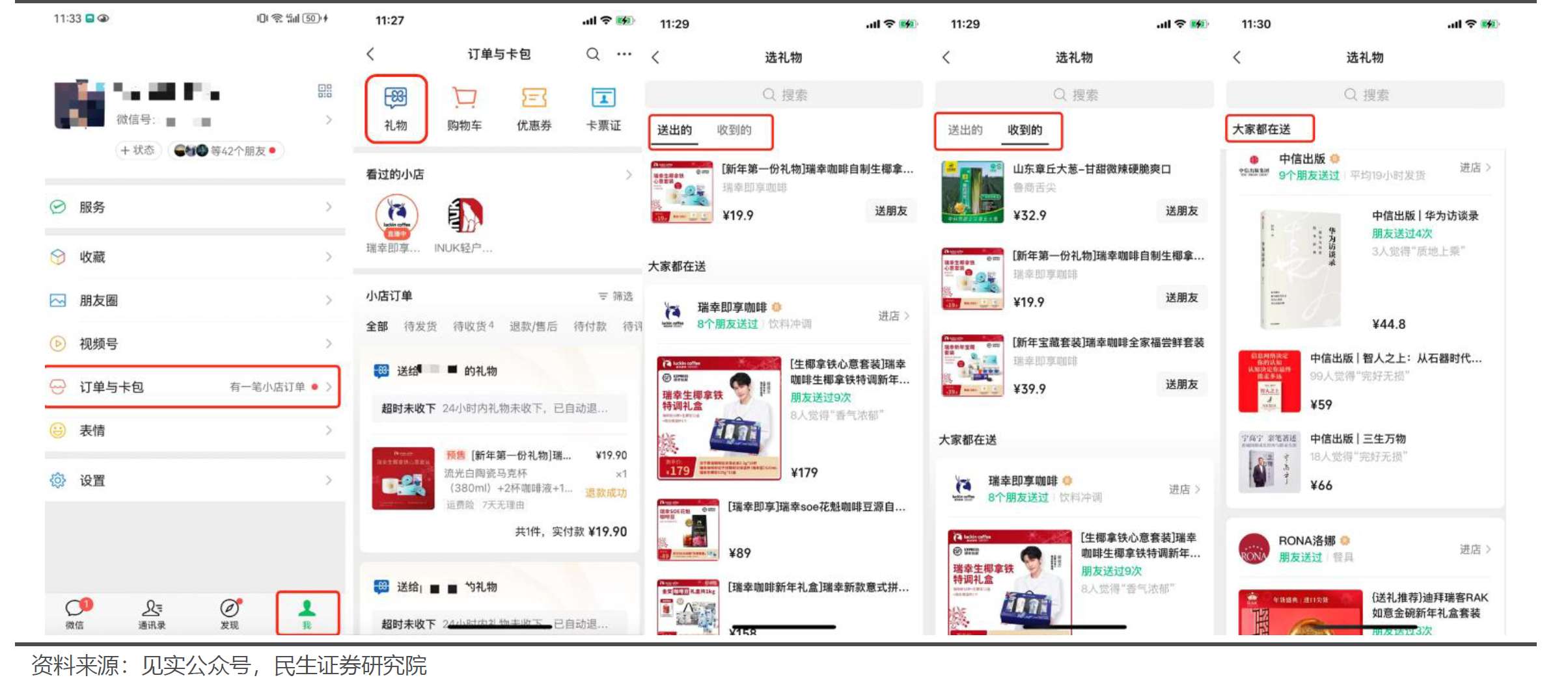 三、微信小店:“送礼物”功能紧密结合微信的社交属性,庞大的用户群体带来天然需求,功能选择在节日较为集中的年末发布亦享受自然流量加持