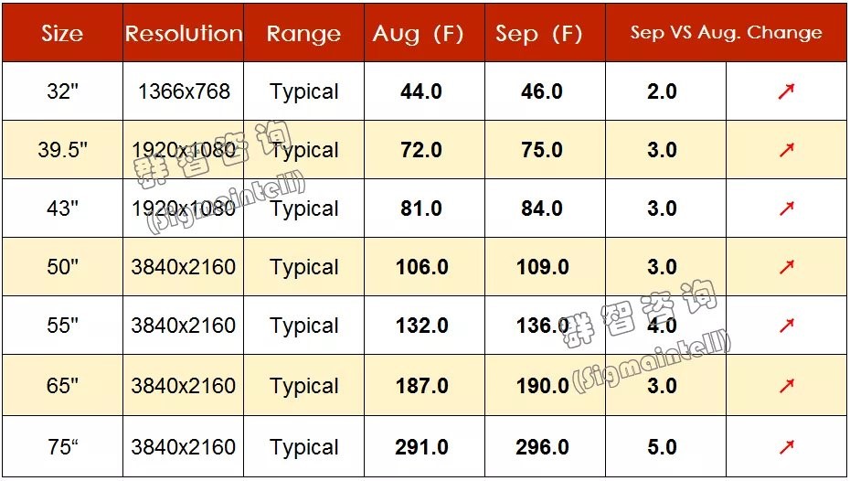 55",该尺寸备货最为积极,8月涨幅维持10美金。
