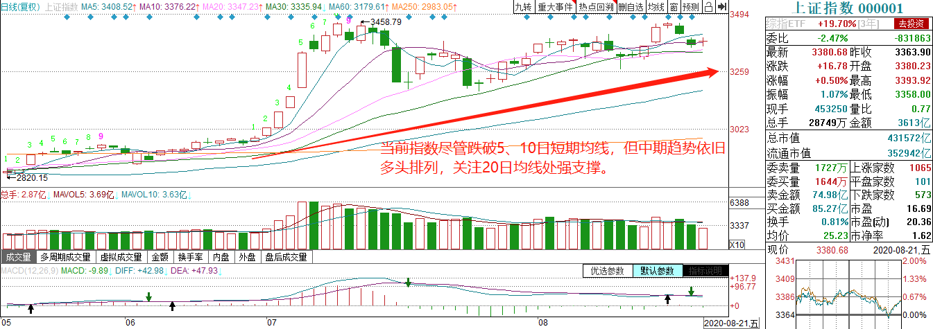 3、当前指数进入关键博弈位置,此诚存亡之秋也。上证指数上周均线收出长上影,本周是反包阳线,还是顺势向下调整,将给出答案;上证指数尽管暂时跌破短期5、10日均线,但整体中期趋势依旧向上,当前关注20日均线处的强支撑位置。创业板在破位后则需尽快回补。