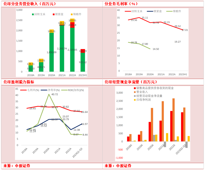 毛利率触底反弹,公司盈利能力逐步修复。2023年三季报公司毛利率26.64%,同比下滑2.45个百分点,环比2023H1上升了0.71个百分点。2023年三季报公司净利率16.97%,同比下降0.59个百分点,环比2023H1上升了7.9个百分点,主要因为锻件和钢球的自供,降低了成本,尤其是圣久锻件采用异形环锻件降本成果显著,以及三季度单季度收到较大投资收益,明显提高了净利率。