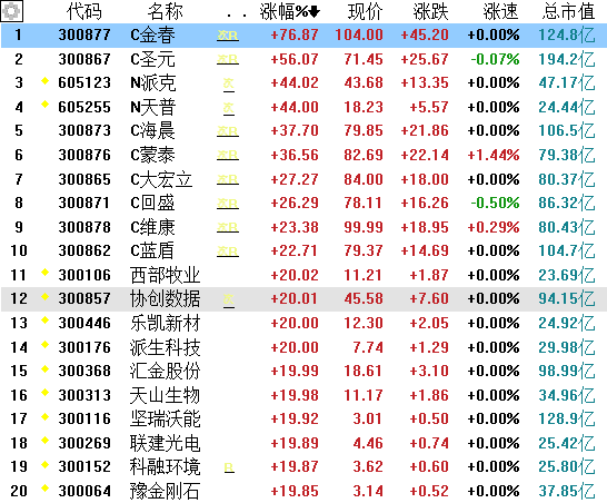 1、创业板尽管放量,但资金青睐注册制新股与“十八罗汉”。在昨日4只个股尝鲜20%涨停板后,今日游资似乎逐步习惯了规则,拉出了10只20%个股,而注册制新股在昨日大涨之下,今日依旧表现火爆,C金春在昨日大涨超90%的情况下,今日继续大涨76%。而市场的人气似乎也均被吸引而去,除了白酒、数字货币有所表现,热点并不集中。