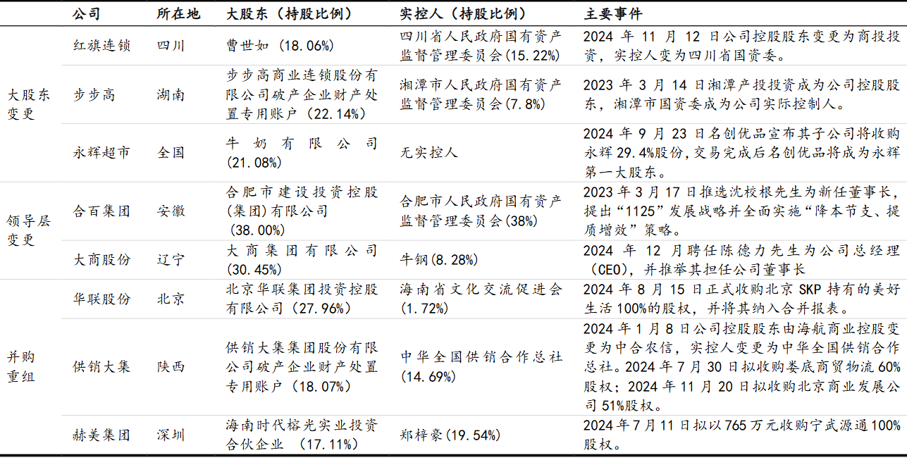 红旗连锁:实控人变为四川国资委,股东拥有丰富农产品资源。2023年12月21 日公司实际控制人曹世如女士及其一致行动人曹曾俊先生,以及股东永辉超市与私四川商投投资签署《股份转让协议》,转让价格为5.88元/股,同时曹世如和曹曾俊承诺在弃权期限内放弃其合计所持红旗连锁剩余的20.72%股份的表决权。2024年11月12日,证券过户完成登记,公司控股股东变更为商投投资,实控人变为四川省国资委。此外根据协议,商投投资将有权向公司提名 4 名非独立董事候选人(含董事长人选)和 3 名独立董事候选人,并推荐副总经理、财务负责人和董事会秘书候选人。红旗连锁股东四川商投及四川乡村发展集团旗下拥有多家农副产品种植及加工企业,以及食品批发企业,有望与红旗连锁广泛的销售渠道相结合,实现业务间协同发展,并优化供应链运转效率,推动红旗连锁经营品类扩充的同时提高盈利水平。