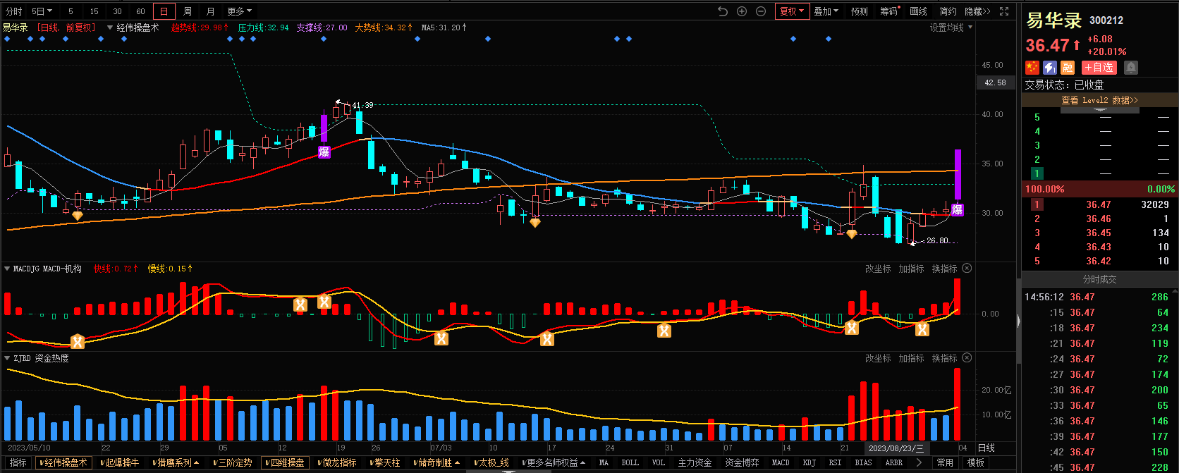 3)参考技术指标:易华录-经伟操盘术-指标出现爆点信号和红色线。