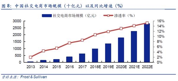 根据Frost & Sullivan 数据,自2013 年起,中国社交电商经历了快速增长,GMV 从2013 年的人民币377 亿元增加至2017 年的人民币6,099 亿元,复合年增长率为100.6%,预计2017 年到2022年GMV将保持35.5%年复合增速,到2022 年达到人民币27826亿元。