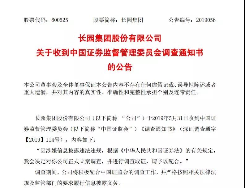 因涉嫌信息披露违法违规,证监会对长园集团正式立案调查。长园集团在相关事项说明中称,公司于2018年12月25日披露了《关于子公司业绩的风险提示性公告》、2019年5月18日披露了《关于子公司长园和鹰相关事项的进展公告》。外界普遍认为,长园集团被立案调查或与子公司长园和鹰涉嫌造假有关。