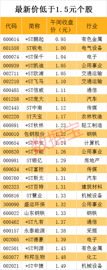 证券时报·数据宝统计显示,截止中午收盘,目前两市共有27只个股低于1.5元,逼近1元面值。一旦打破面值后,这些个股也将进入退市的倒计时。