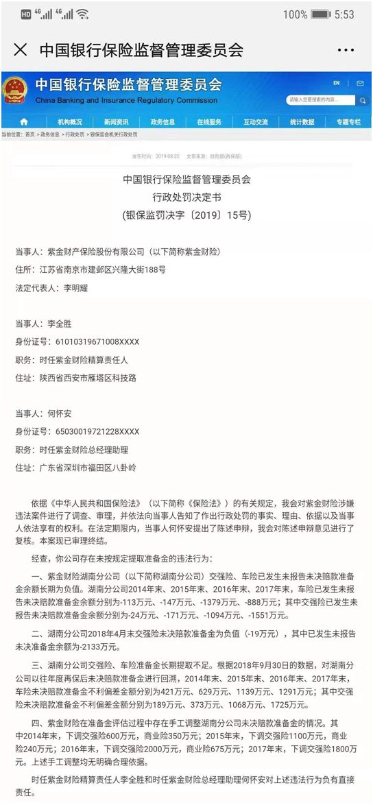 8月22日,银保监会挂出今年第15号行政处罚决定书显示,银保监会对紫金财险涉嫌违法案件进行了调查、审理,并依法向当事人告知了作出行政处罚的事实、理由、依据以及当事人依法享有的权利。在法定期限内,当事人何怀安提出了陈述申辩,银保监会对陈述申辩意见进行了复核。本案现已审理终结。