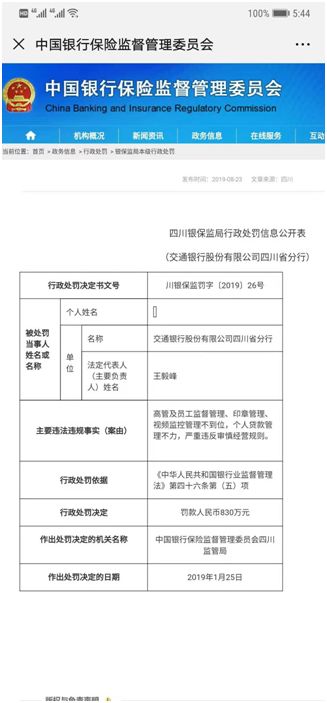 四川银保监局今日挂出一份行政处罚显示,交通银行股份有限公司四川省分行因存在“高管及员工监督管理、印章管理、视频监控管理不到位,个人贷款管理不力,严重违反审慎经营规则”等违法违规事实,依据《中华人民共和国银行业监督管理法》第四十六条第(五)项,对其罚款人民币830万元。文件显示,该项处罚是在今年1月25日做出的。