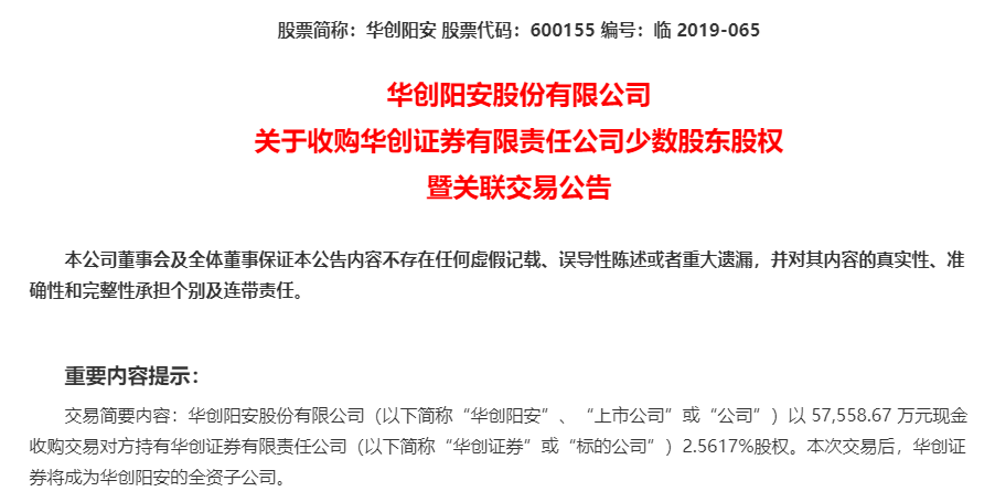 日前,华创阳安公告,公司拟收购华创证券少数股东股权,涉及股份份额为2.5617%,收购价格为5.76亿元。在交易后完成后,华创证券将成为华创阳安的全资子公司。