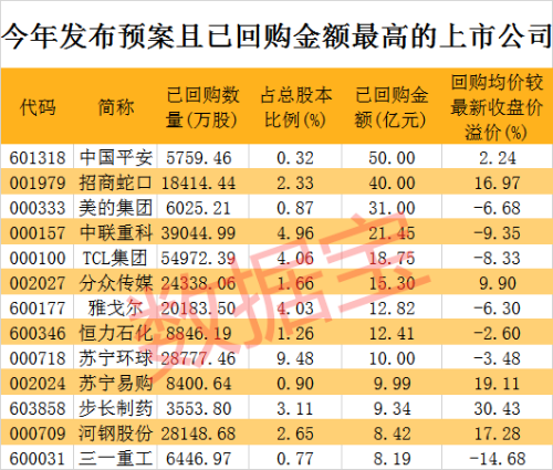 仅以今年以来发布预案的公司来看,114家公司实施回购金额超过1亿元。中国平安、招商蛇口、美的集团、中联重科等9股回购金额超过10亿元。
