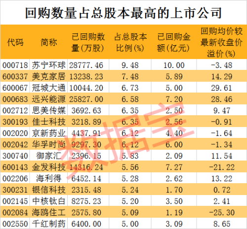 上市公司股份回购数量井喷 15家公司回购比例超5%