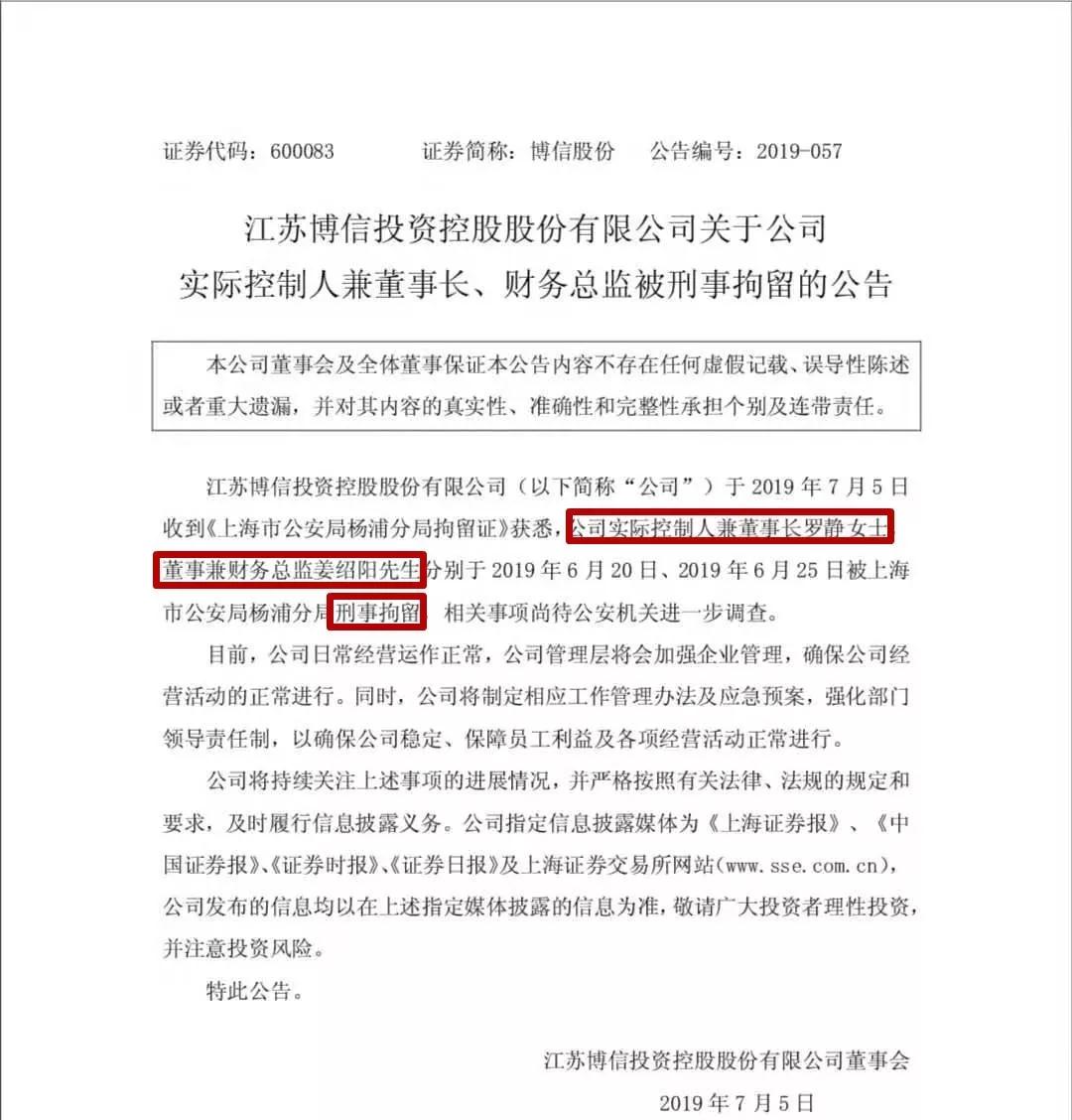 公告显示,公司7月5日收到《上海市公安局杨浦分局拘留证》,获悉公司实际控制人兼董事长罗静、董事兼财务总监姜绍阳分别于2019年6月20日、2019年6月25日被上海市公安局杨浦分局刑事拘留,相关事项尚待公安机关进一步调查。