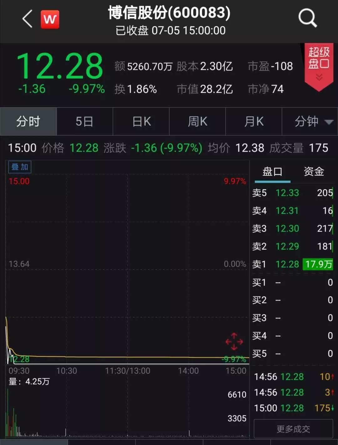 7月5日,博信股份盘中跌停,今日收报12.28元,跌幅达9.97%。