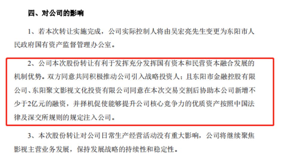 上述公告中提出,东阳市金融控股有限公司、东阳聚文影视文化投资有限公司将提供给吴宏亮一笔借款,以解除后续转让股份的质押。此外,东阳国资方面还承诺,将协助唐德影视获得不少于2亿元的融资,未来还将有望将优质资产注入公司。