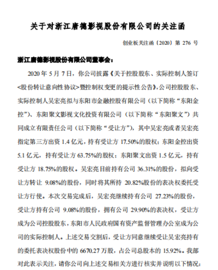 同时,唐德影视“易主”一事也引来监管关注。5月8日上午,深交所向唐德影视下发了最新关注函,要求公司说明筹划控制权变动事项的背景、过程、目的及对公司的影响,转让控制权的原因及必要性等。