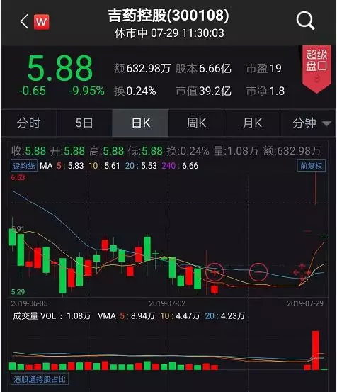 7月25日,吉药控股股价报收5.94元/股,成交额为2916万元。7月26日,吉药控股继续涨停开盘,后有短暂的开板情况,但又迅速封板。当日股价报收6.53元/股,成交量大幅放大,全天成交2.52亿元。截至收盘,当日仍有逾6万手买单等待交易。按照6.53元/股的价格计算,相当于还有近4000万元资金等待买入。