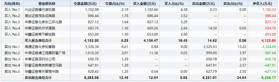 卖出前五席位分别为海通证券北京知春路营业部、中信证券浦江恒昌财富广场营业部、华泰证券深圳分公司、财富证券南京新模范马路营业部和华鑫证券常州晋陵中路营业部,合计卖出6251.01万元。