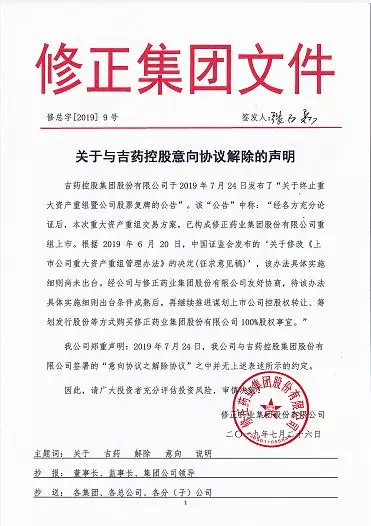修正药业发表声明称,公司与吉药控股签署的《意向协议之解除协议》中并无“待条件成熟后,再继续推进谋划上市公司控股权转让、筹划发行股份等方式购买修正药业100%股权事宜”的相关约定。
