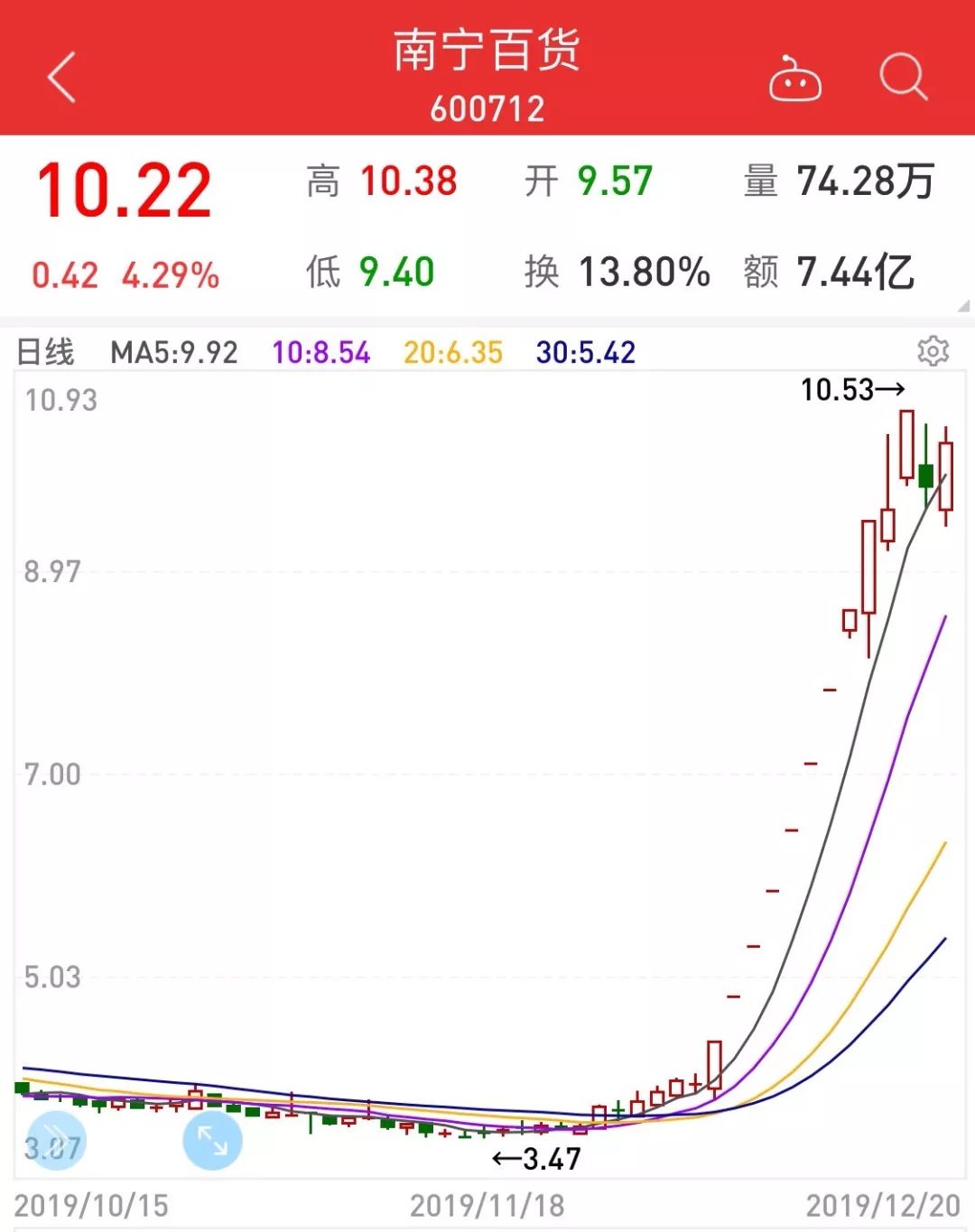 与此同时,值得注意的是,“宝能系”通过拍卖平台大举增持并一举上位成为第一大股东之后,南宁百货股价连续涨停,近11个交易日收获10个涨停板。12月18日晚间,南宁百货回复上交所问询函称,目前公司不存在正在筹划涉及公司的重大事项,也不存在其他可能对公司股价产生较大影响的重大事件;公司基本面未发生变化,日常经营情况正常。