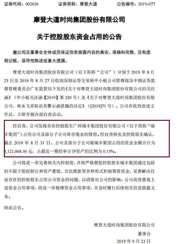9月23 日,摩登大道披露公告,称公司存在控股股东广州瑞丰集团股份有限公司(下称瑞丰集团)占用公司及部分子公司库存现金的情形。公告显示,截至2019年8月31日,摩登大道及部分子公司被瑞丰集团占用的资金余额合计为312.11万元,占最近一期经审计净资产的比例为0.13%。