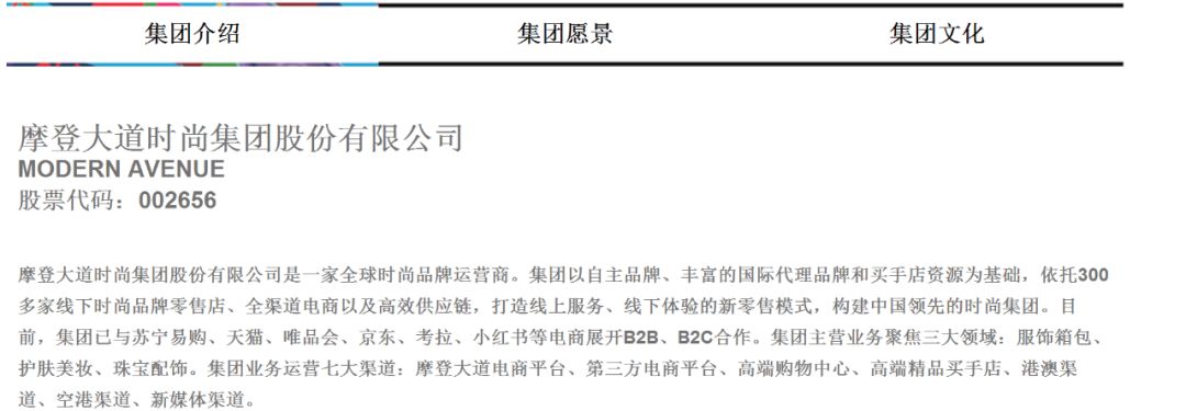 公开资料显示,摩登大道于2012年2月登陆A股,公司从事的主要业务在时尚零售业务领域,经营的自有品牌包括卡奴迪路CANUDILO、CANUDILO H HOLIDAYS、DIRK BIKKEMBERGS等。