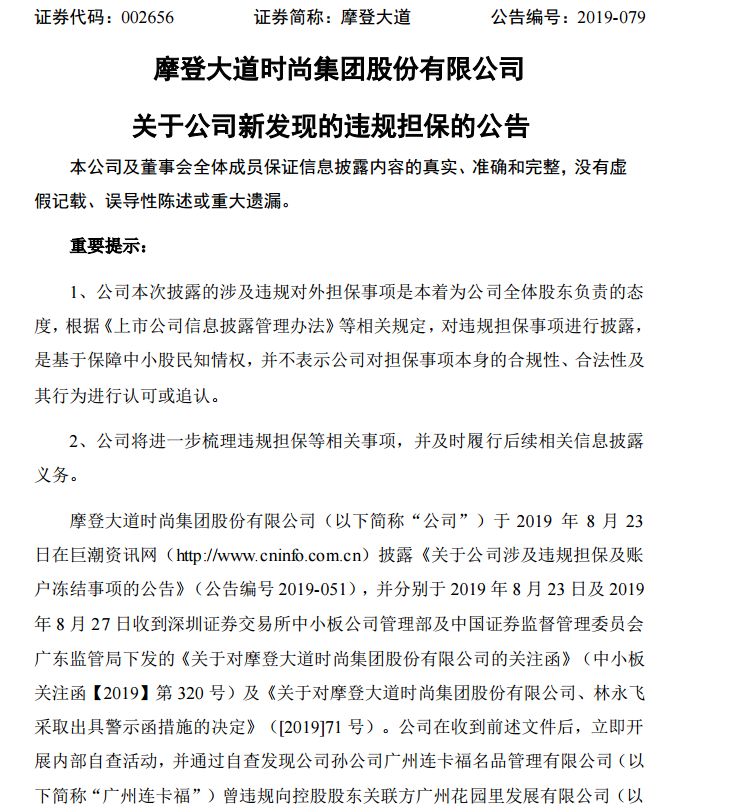 具体来看,2019年9月27日摩登大道披露,通过自查发现孙公司广州连卡福名品管理有限公司(下称广州连卡福)曾违规向控股股东关联方广州花园里发展有限公司(下称花园里公司)提供担保而未履行审批及披露程序。