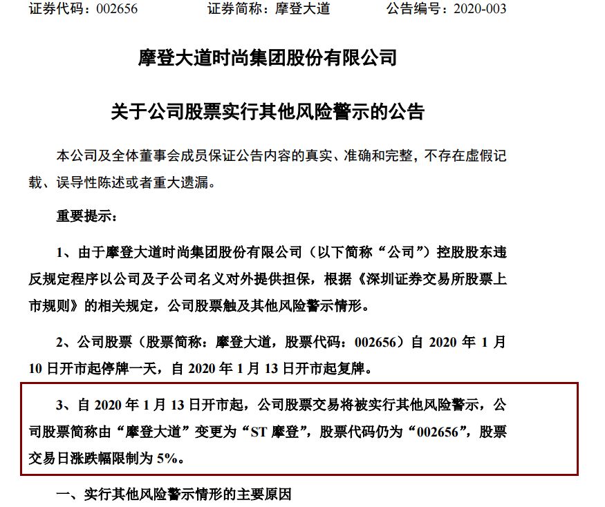 因大股东瑞丰集团违规担保被ST,摩登大道成为2020年第一家“戴帽”股。
