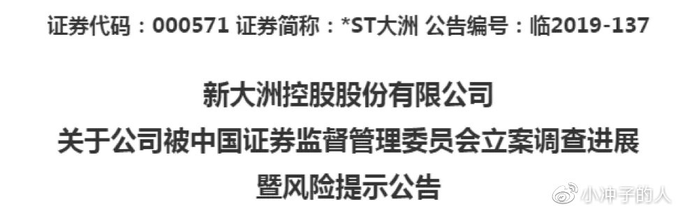 其次,*ST大洲目前还在被立案调查过程中。今年1月11日,公司收到中国证监会《调查通知书》(编号:琼调查字2019001号),因公司涉嫌信息披露违法违规,对公司进行立案调查。