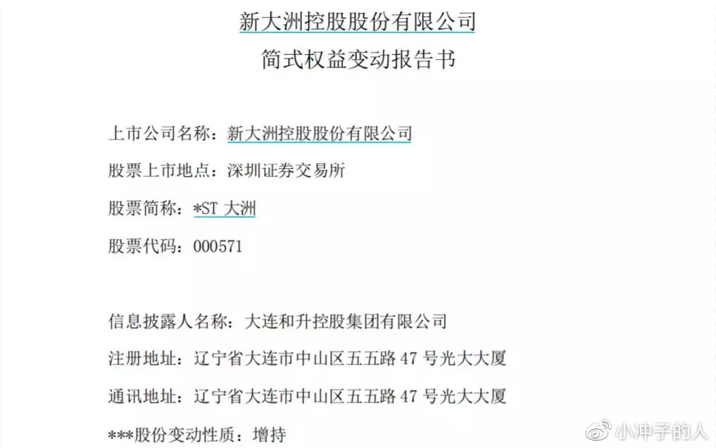 *ST大洲12月9日晚间发布公告称,大连和升控股于9月2日至12月6日在二级市场累计买入4070.27万股公司股份,占总股本的5%。