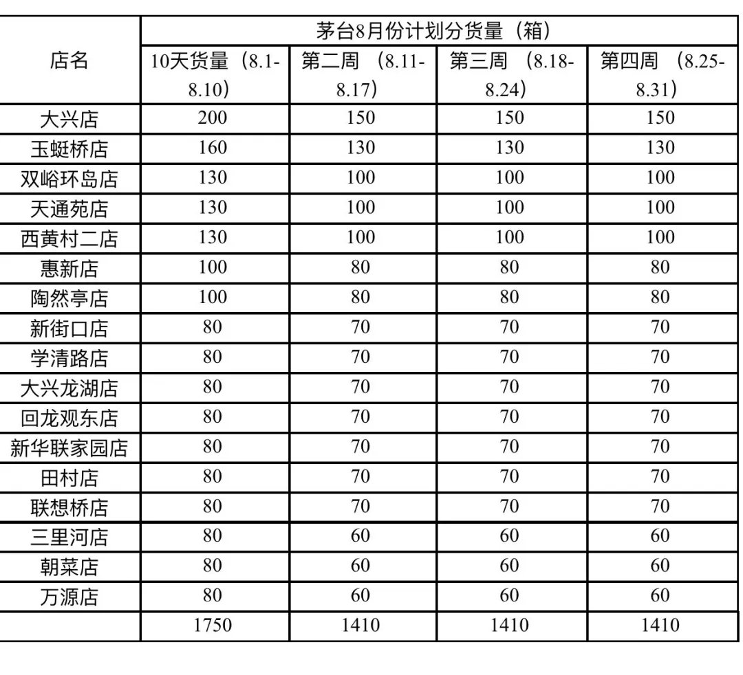 物美内部人士向中证君提供的资料显示,此次预售活动在物美全北京市的17家门店同时举行,在8月1日-10日的10天里,计划分货量为1750箱,随后的三周,计划分货量均为1410箱。