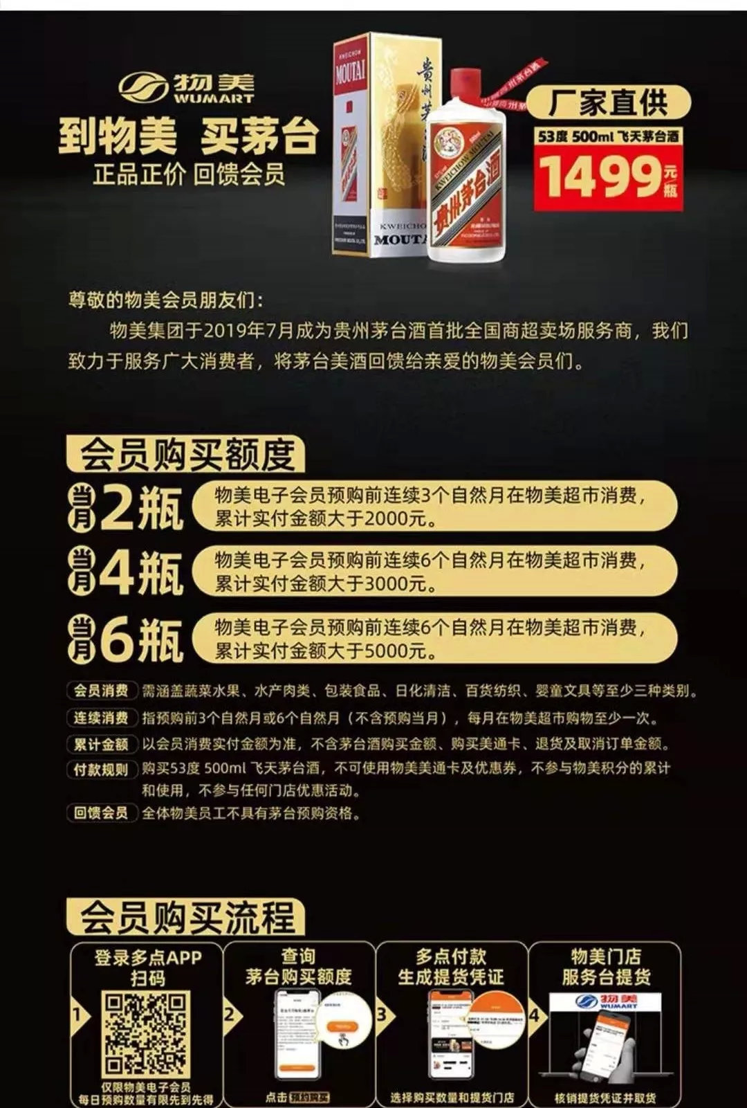 中证君发现,物美为1499元的飞天茅台设置了非常高的门槛。比如,要首先成为物美会员,并且连续三个月在物美超市消费,且累计实付金额超过2000元,才有当月2瓶的配额。