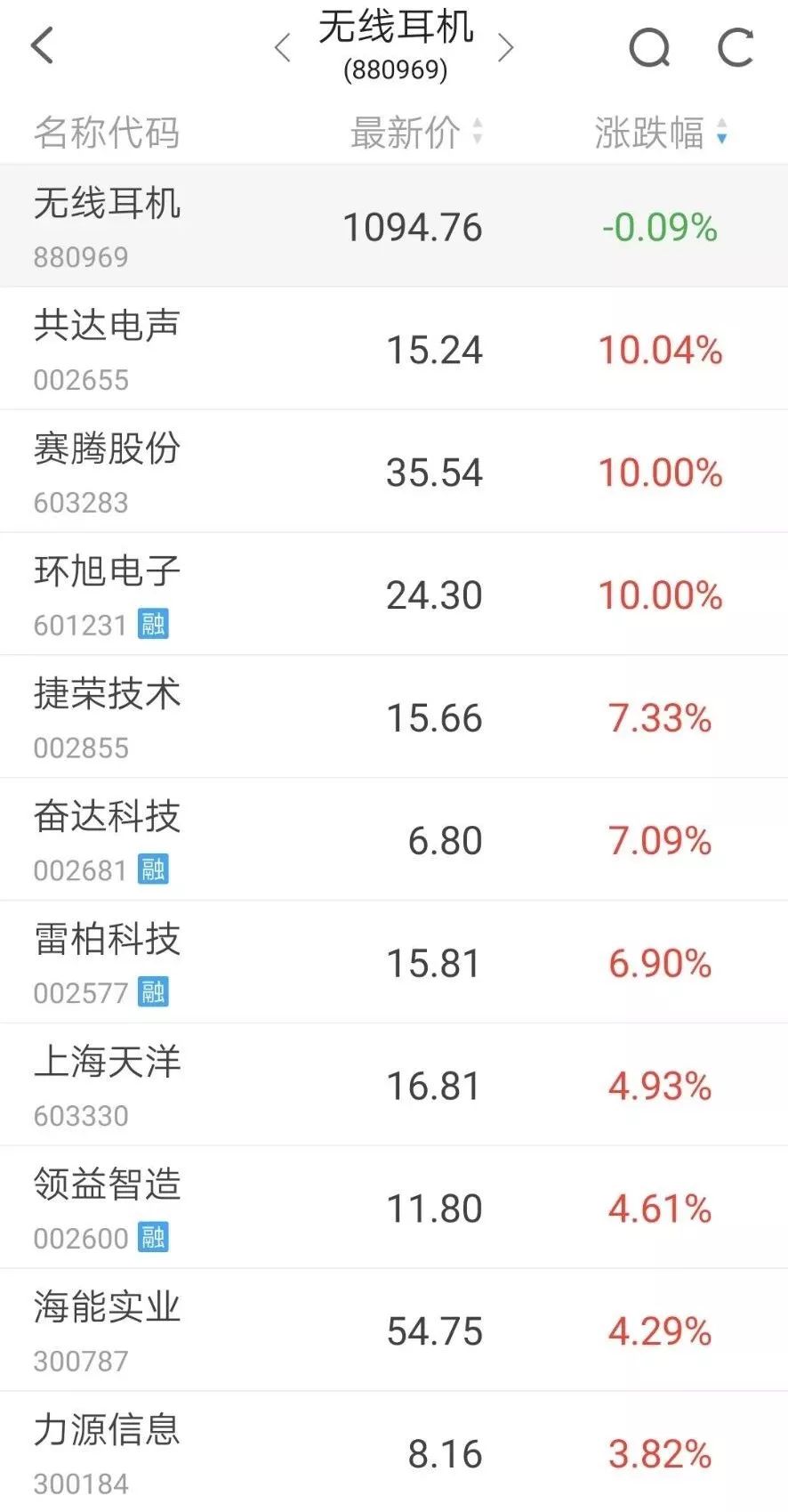 龙头股漫步者出现罕见闪崩,但无线耳机题材并没有出现集体大幅回落情形。