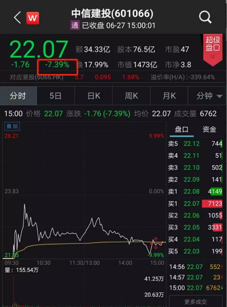 6月26日,中信建投股票无悬念跌停,截至当日收盘,股价报收23.83元,封单超过72万手。