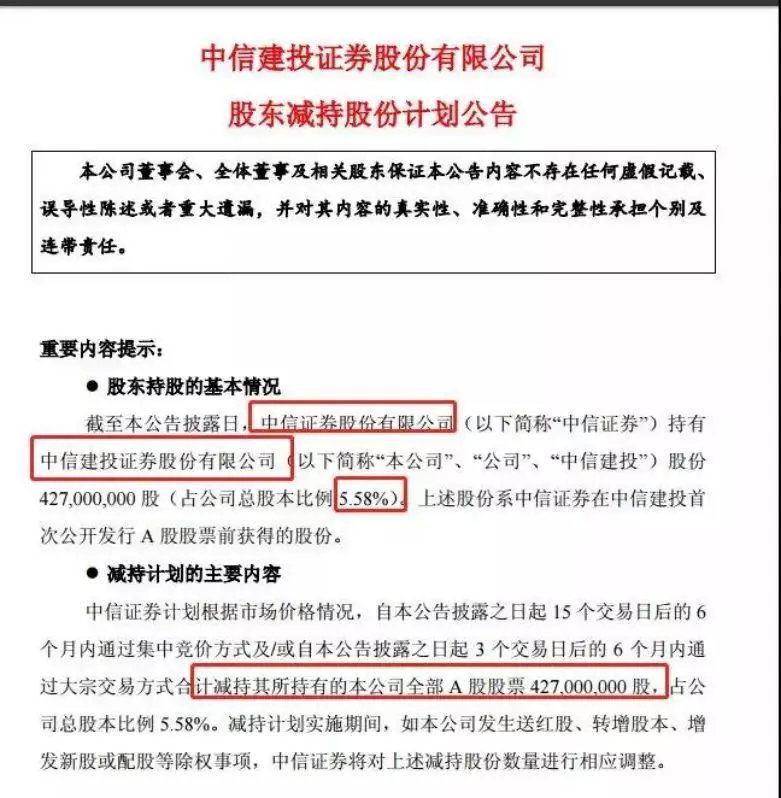 6月25日晚间,中信建投大股东之一中信建投提出股份减持计划公告,准备抛售手中全部持有的中信建投A股股票。据公告显示,中信证券持有中信建投股份 427,000,000 股(占公司总股本比例 5.58%)。这些股份是中信证券在中信建投首次公开发行A股股票前获得的股份。