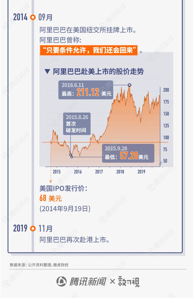 美东时间2014年9月18日阿里登陆纽交所,发行价68美元/股,不计超额认购行权,IPO募资约218亿美元,若计入可高达250亿美元,创美股史上最高IPO融资记录。