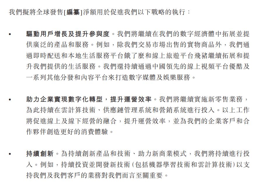 在电商平台的竞争中,阿里巴巴也不断面临新的玩家。阿里巴巴称,此次IPO募集的资金将主要用于驱动用户增长及提升参与度、助力企业实现数字化转型,提升运营效率、持续创新三个战略方向。
