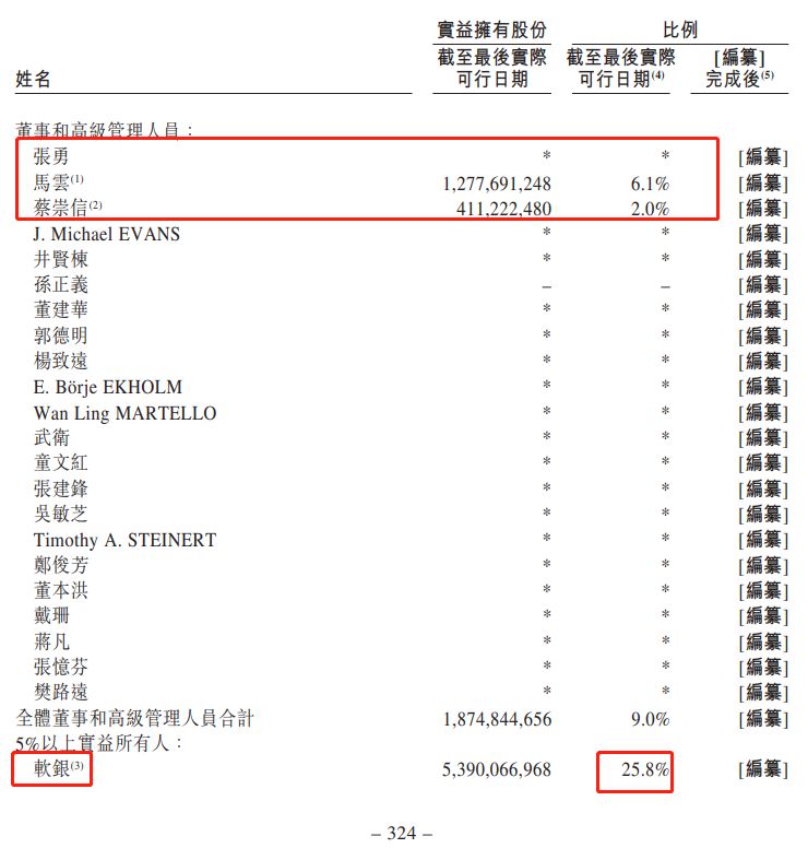 截至最后实际可行日期,马云和蔡崇信分别实益拥有约6.1%和约2.0%已发行在外股份。截至最后实际可行日期,董事和高级管理人员(包括马云和蔡崇信)共计拥有约9.0%已发行在外股份。