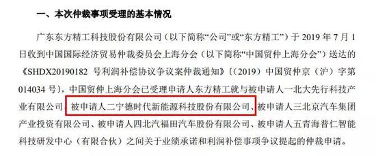 据东方精工的公告披露,公司收到中国国际经济贸易仲裁委员会上海分会送达的通知,后者已受理申请人东方精工就与北大先行、宁德时代、北汽产投、福田汽车、青海普仁等5位被申请人关于业绩承诺和利润补偿事项争议提起的仲裁申请。