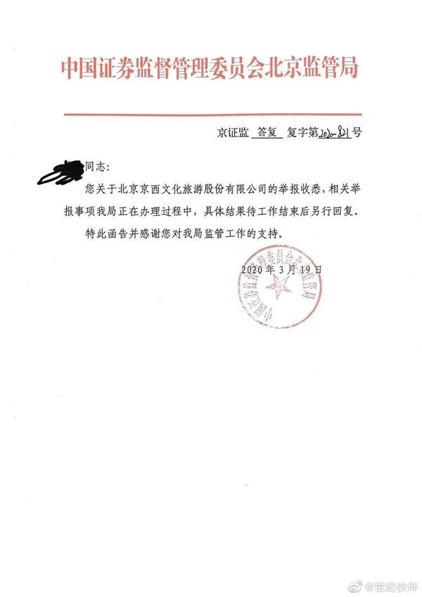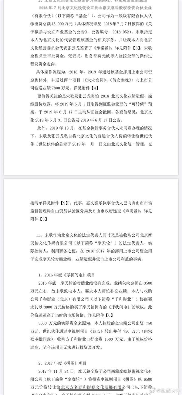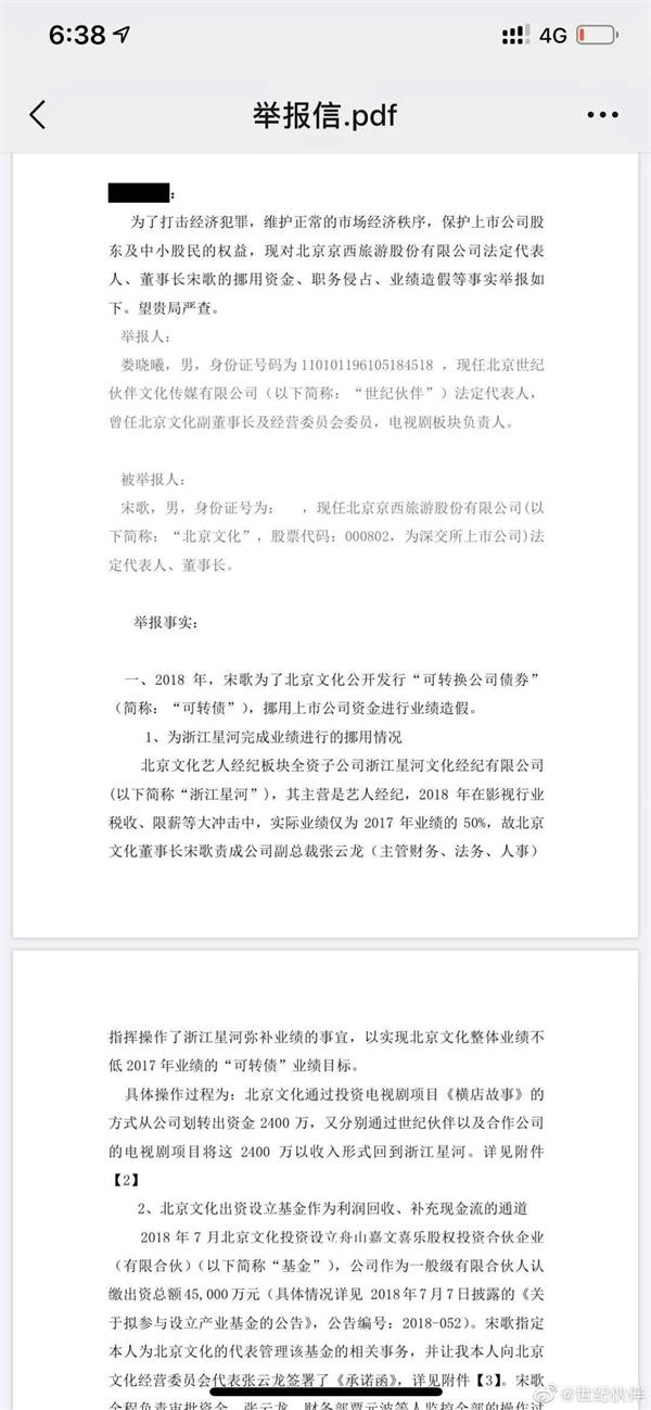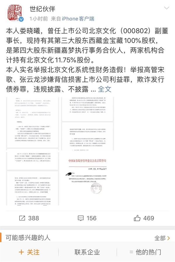4月29日晚间,北京文化(000802.SZ)旗下子公司北京世纪伙伴文化传媒股份有限公司(以下简称“世纪伙伴”),通过认证微博@世界伙伴发布一条以北京文化原副董事长娄晓曦的名义,向证监会举报北京文化(000802.SZ)系统性财务造假,董事长宋歌与公司副总裁张玉龙涉嫌“损害上市公司利益罪,欺诈发行债券罪,违规披露、不披露重要信息罪,职务侵占罪”。