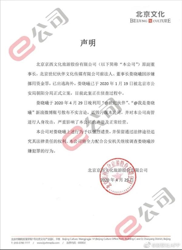 据证券时报,北京文化深夜发布声明回应娄晓曦实名举报公司财务造假:公司原副董事长娄晓曦因涉嫌挪用资金罪,已出逃海外。