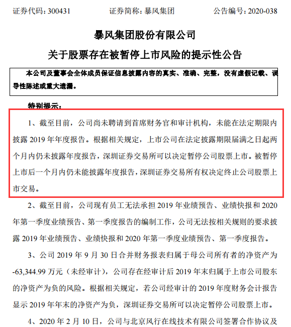 在疫情的影响下,推迟发布2019年年报的上市公司数量颇多。然而,目前仍未聘请审计机构、亦未作出年报延期安排的A股公司,就只有暴风集团一家。按照交易所规定,上市公司年度报告披露期限为每年的4月30日,如果6月30日暴风集团仍然无法披露2019年年报,即会被交易所暂停上市;如果7月30日暴风集团仍然无法披露2019年年报,就会被交易终止上市。