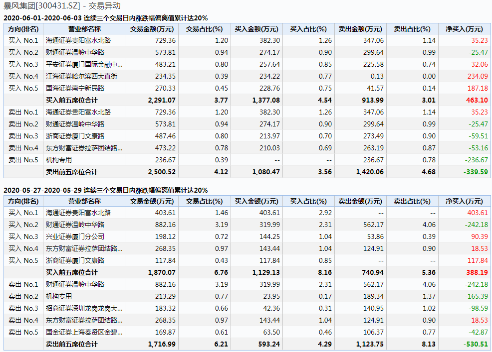 而从龙虎榜来看,暴风集团在最近这8个交易日中多次上榜。其中,5月27日~5月29日连续三个交易日内涨跌幅偏离值累计达20%,6月1日~6月3日也是连续三个交易日内涨跌幅偏离值累计达20%。